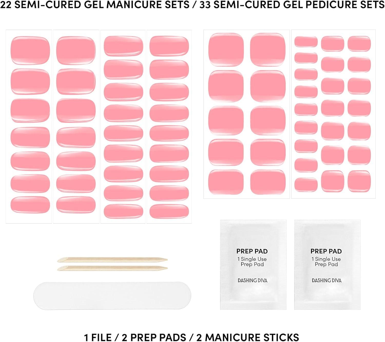Includes: Semi-cured gel manicure strips for hands and toes, LED mini lamp, prep pads, nail file, wooden manicure stick. Gradually remove nail strips with nail oil and cuticle stick
