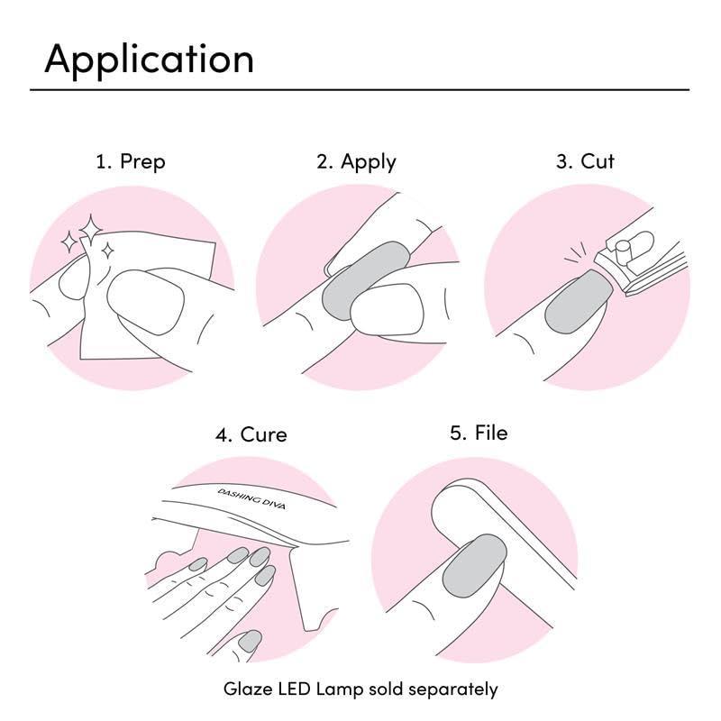 How To Use: PREP: Wash hands, shape nails, push back cuticles. Use Prep Pad to remove oils; ensure nails are dry. SELECT SIZE: Match strip to nail—if between sizes, size down. APPLY: Lift strip, place just above cuticle, press outward. REMOVE FILM and press strip firmly center to sides. TRIM excess with scissors/clippers. CURE under LED light (sold separately) for 60 seconds