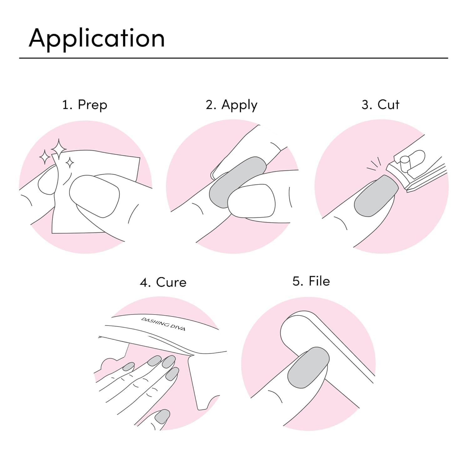 How To Use: PREP: Wash hands, shape nails, push back cuticles. Use Prep Pad to remove oils; ensure nails are dry. SELECT SIZE: Match strip to nail—if between sizes, size down. APPLY: Lift strip, place just above cuticle, press outward. REMOVE FILM and press strip firmly center to sides. TRIM excess with scissors/clippers. CURE under LED light for 60 sec. Pro Tip: Keep unused strips away from LED light to prevent premature curing. Store in container during use