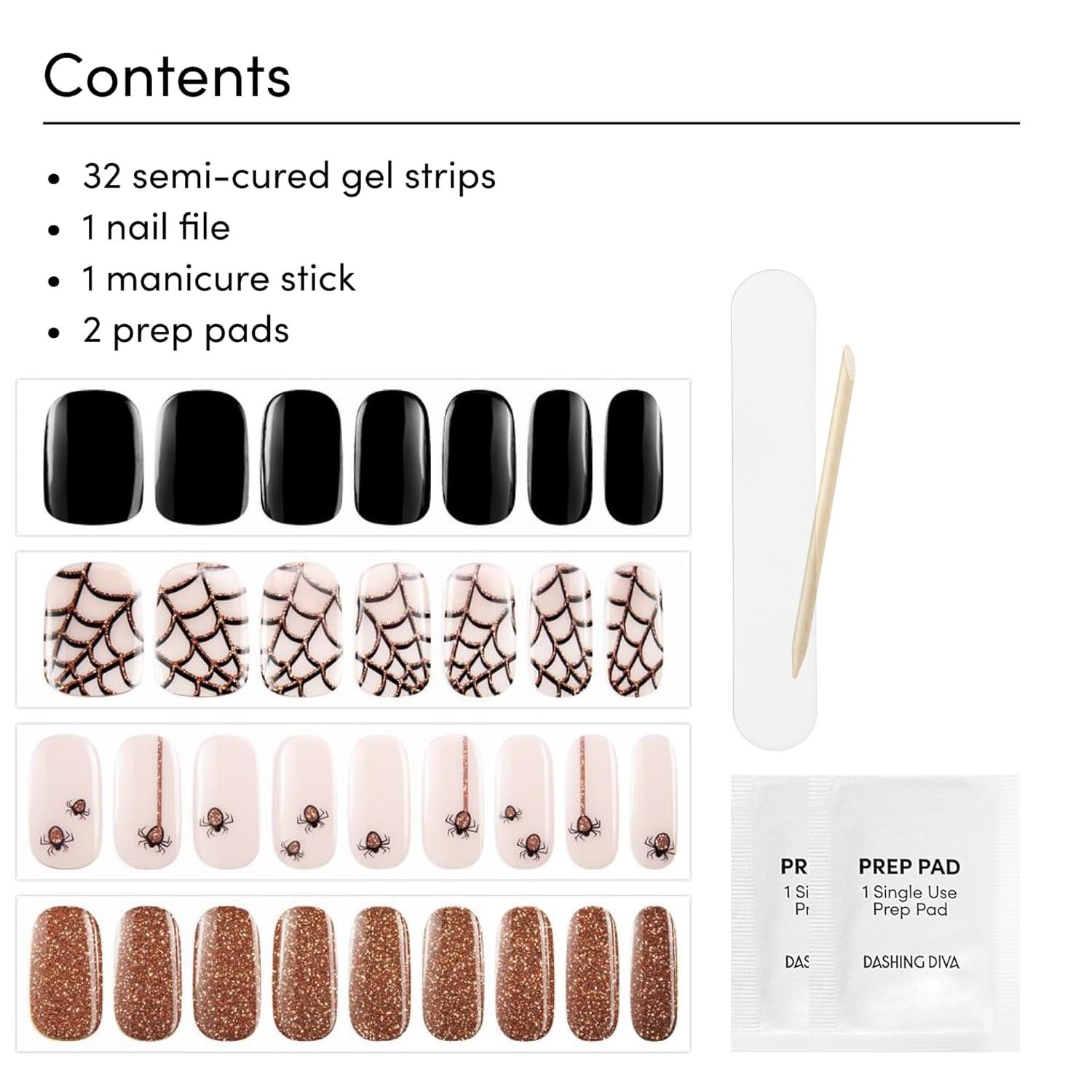 Dashing Diva Glaze Nail Strip Set - Arachnophobia - Long Lasting, Chip Resistant, Semi-Cured Gel Nail Strips - Halloween Gel Set - 4-Piece Manicure Kit with 32 Strips(Arachnophobia)
