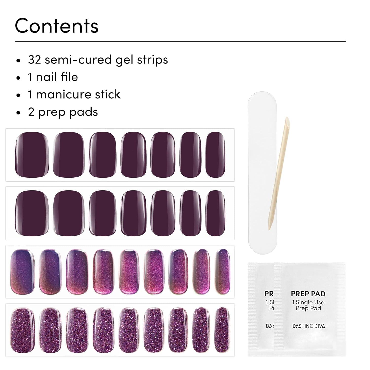 4-Piece Manicure Set: 32 semi-cured gel manicure strips, 2 prep pads, 1 nail file, and 1 manicure stick. Gradually remove nail strips with the Dashing Diva Magic Off+ Remover, sold separately