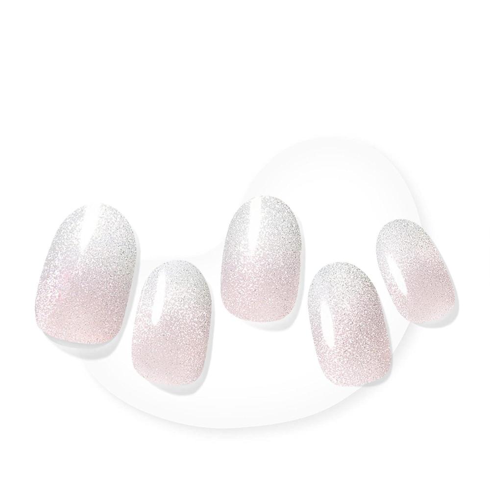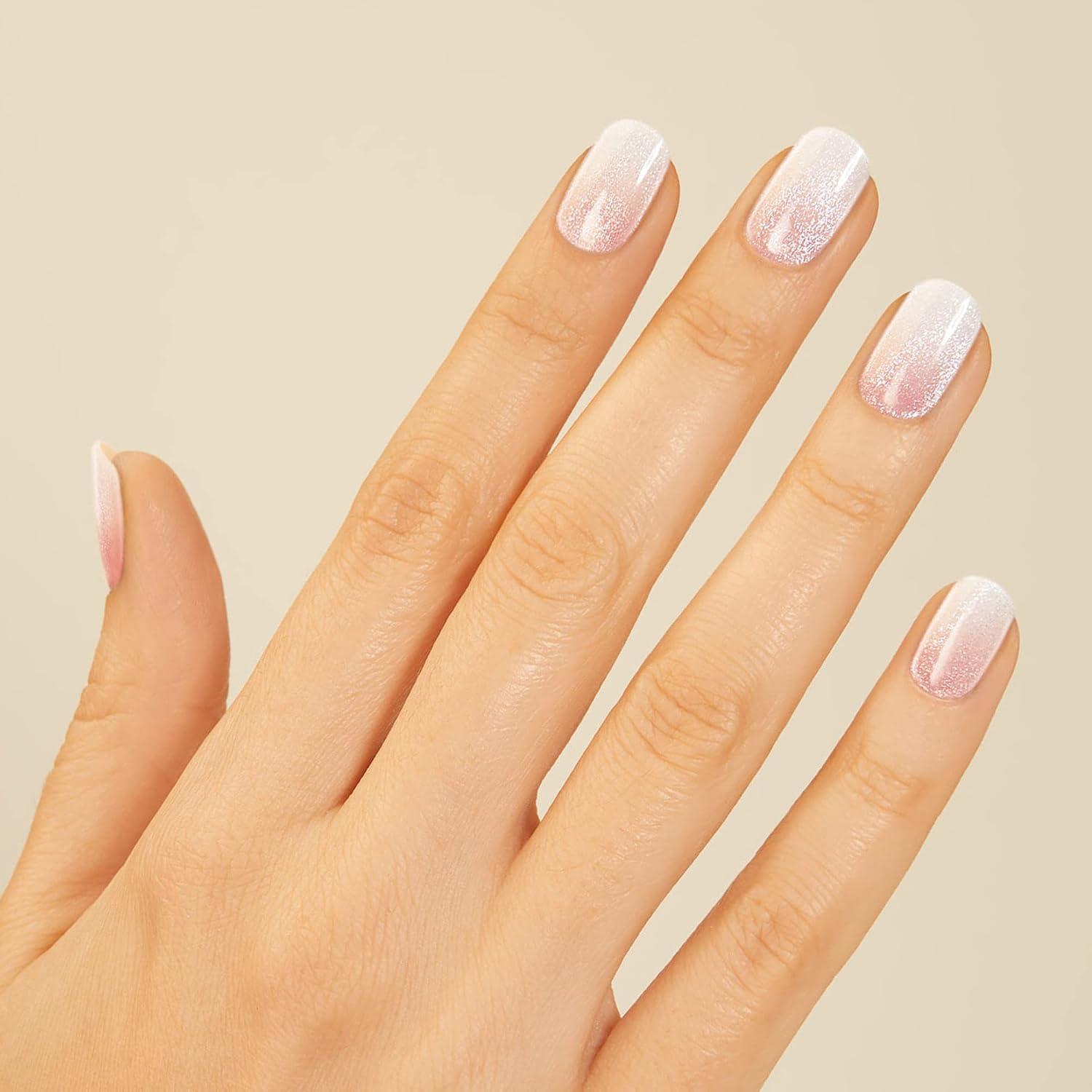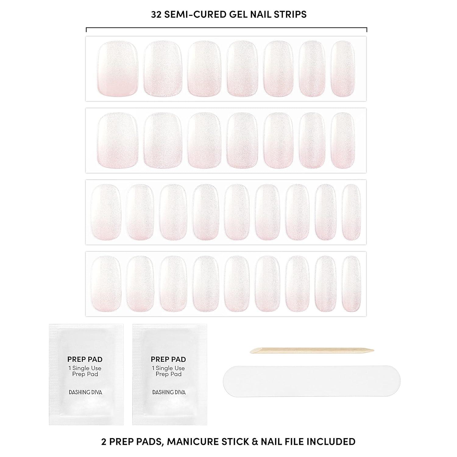 IN THE BUFF: Stripped down to one sheer, luxurious layer of sparkles. Semi-cured white ombré gel nail strips featuring velvet shimmer with mega volume and maximum shine.
