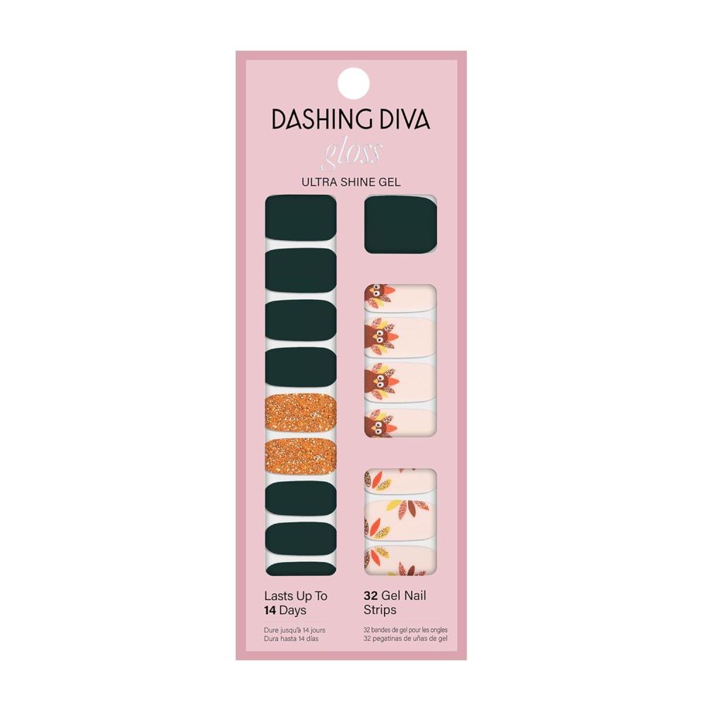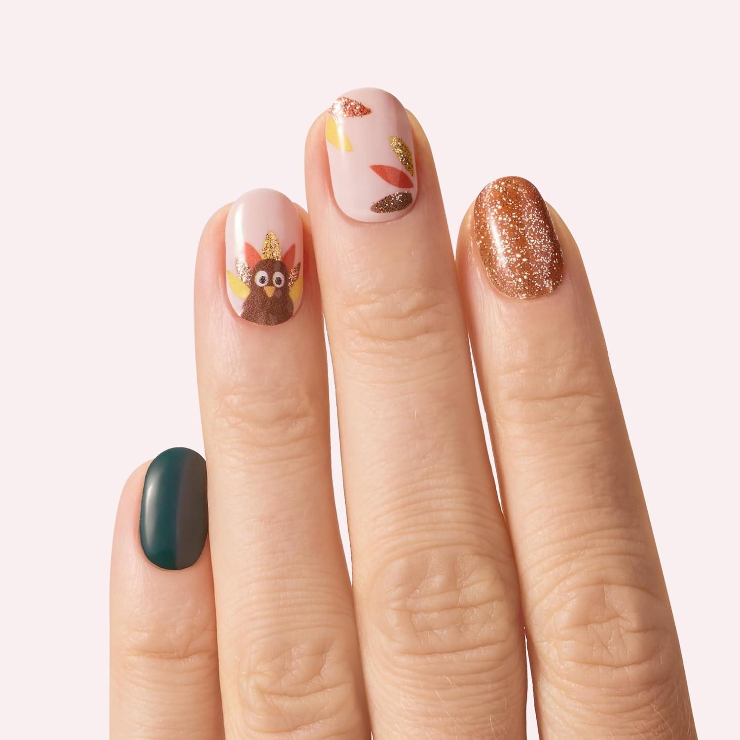 Fowl Play: Did someone say turkey time? Hunter green gel nail strips are paired with accents featuring burnt orange glitter, ivory with fall-hued feathers, and of course our friendly Fowl herself—all with a glossy, high-shine finish